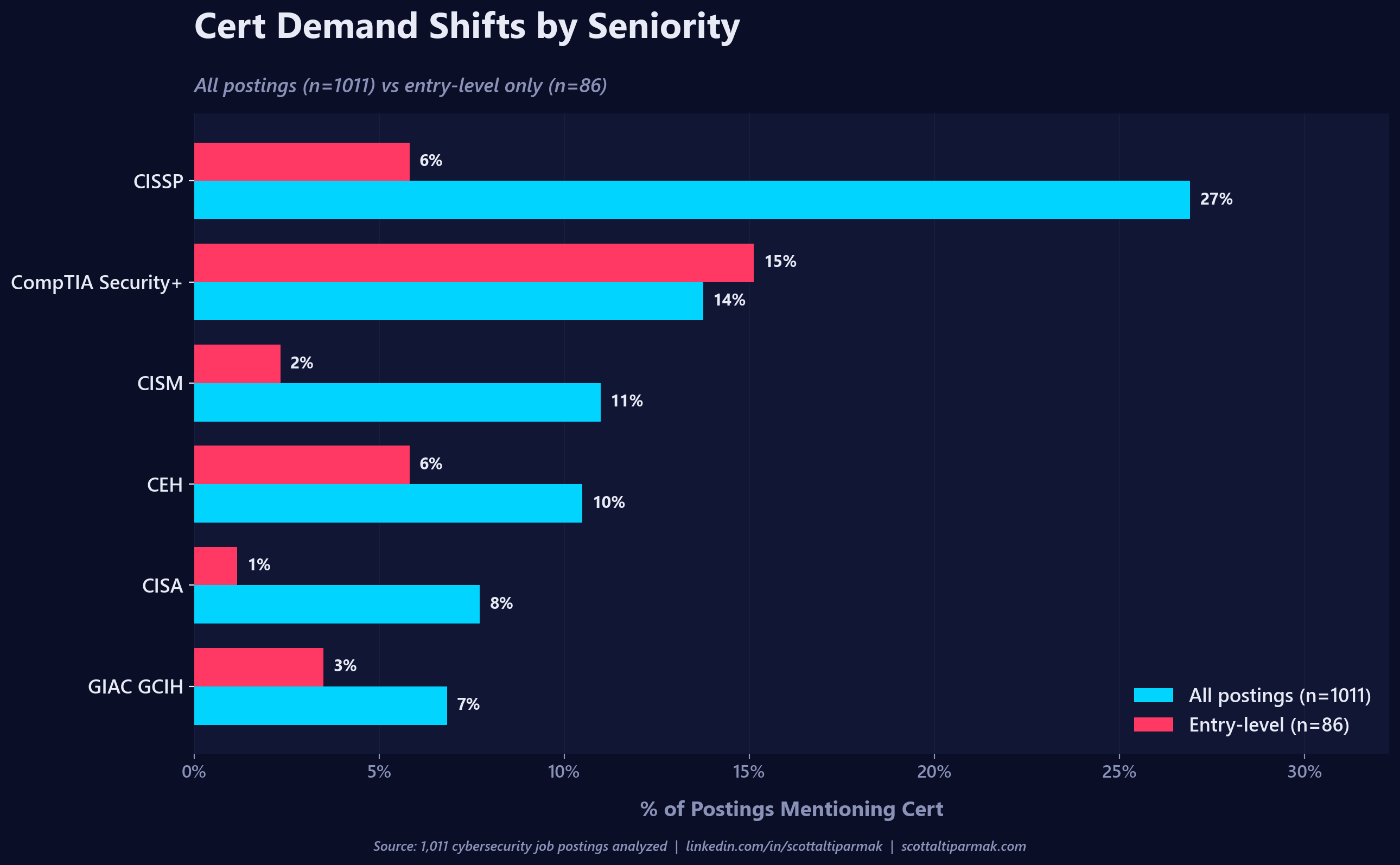 Security+ is the actual entry-level standard. It appears in 15.1% of entry postings, 2.6 times as often as CISSP. If you are trying to break in, get Security+. Treat CISSP mentions on entry postings as noise in the preferred section, not as a serious requirement, and definitely not as a reason to spend money on an ISC2 exam you cannot yet hold the credential for.