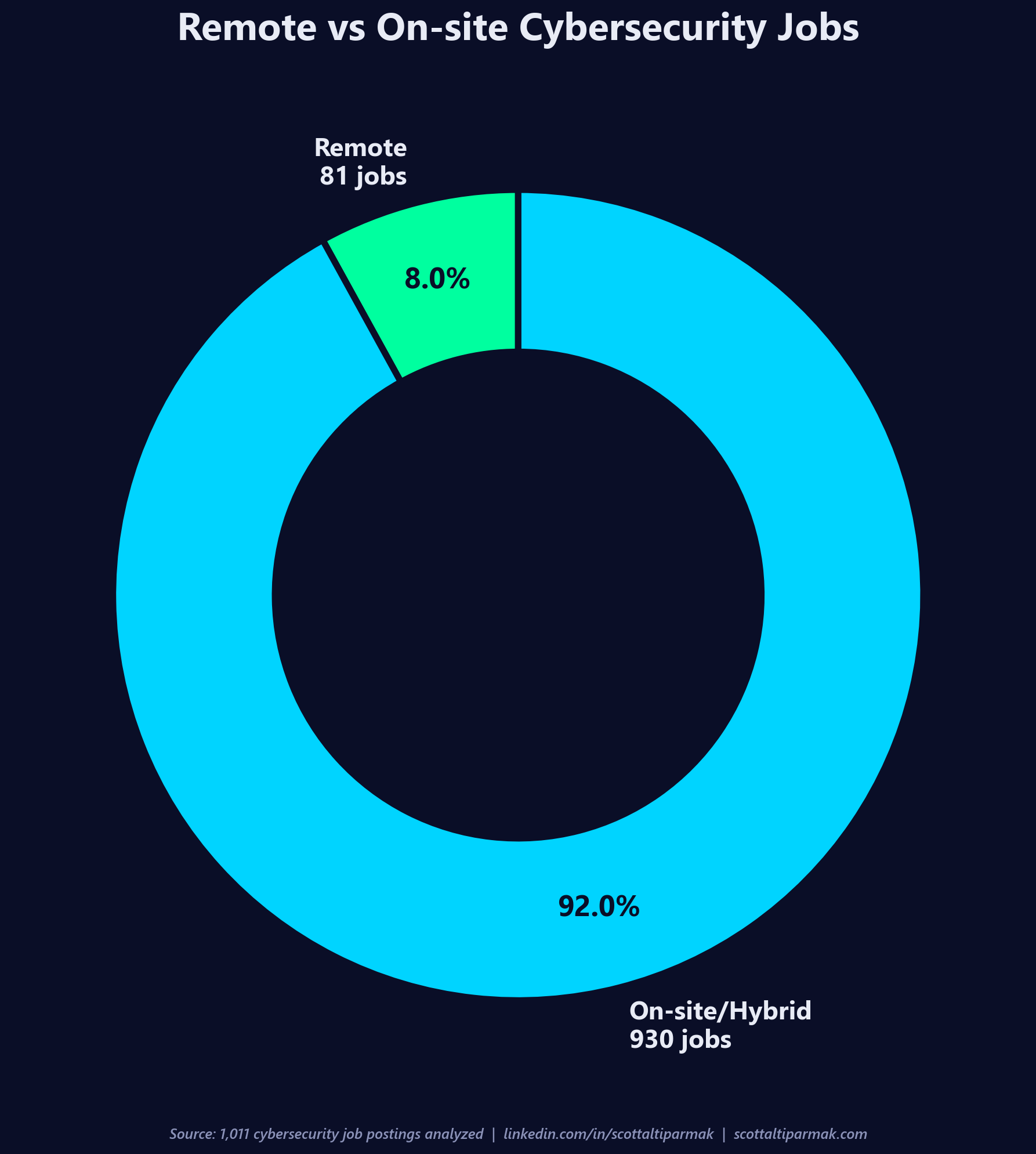 Only 81 of the 1,011 postings are explicitly tagged as remote. 8.0%. The rest are onsite, hybrid, or ambiguously worded in a way that defaults to non-remote. Some of the 92% are certainly hybrid roles with a generous work-from-home allowance, and I did not attempt to separate those from strict onsite requirements in this pass. But the pandemic-era assumption that cybersecurity is a remote-first field is dead in this dataset. If you are optimizing for a remote security career in 2026, you are playing for 8% of the market.