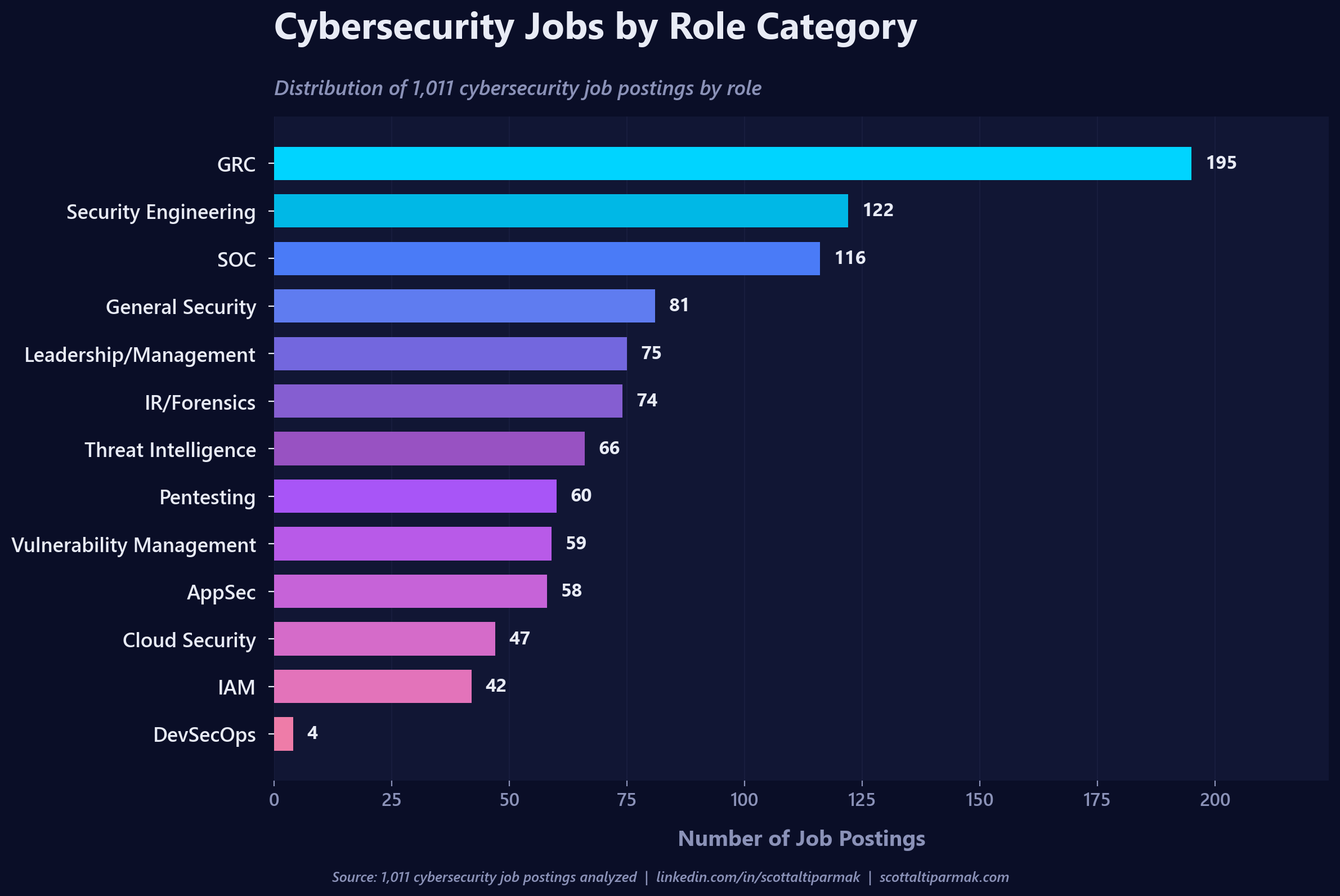 - DevSecOps at 4 postings. This one is almost certainly a labeling artifact. The industry keeps saying "shift left" and "DevSecOps" in every keynote, but almost nobody writes a job req with that title. The actual work is buried inside AppSec, Cloud Security, and Security Engineering roles. If you are chasing DevSecOps as a title, you are chasing a hashtag. Chase the skills instead.