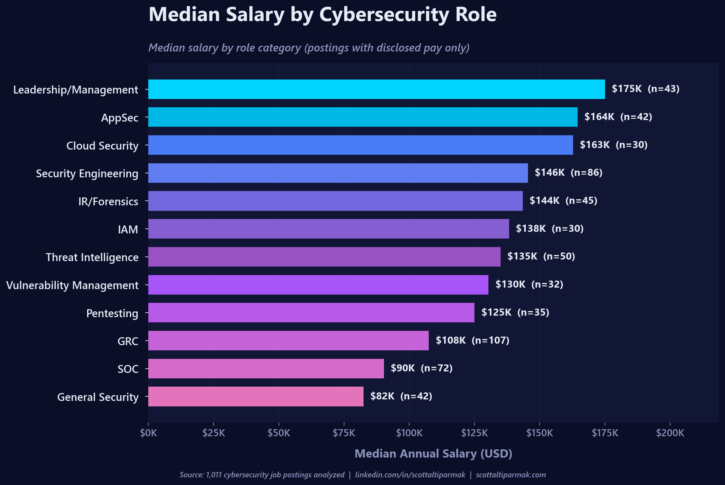 Security Engineering, Cloud Security, and AppSec pay the best. SOC and GRC pay the least. This is not a surprise, but it is a useful correction for students who assume the path into security starts with a SOC analyst role and goes up from there. The SOC floor is lower than most people realize, and the ceiling is lower too. If you want to maximize lifetime earnings, the SOC is a stepping stone, not a destination.