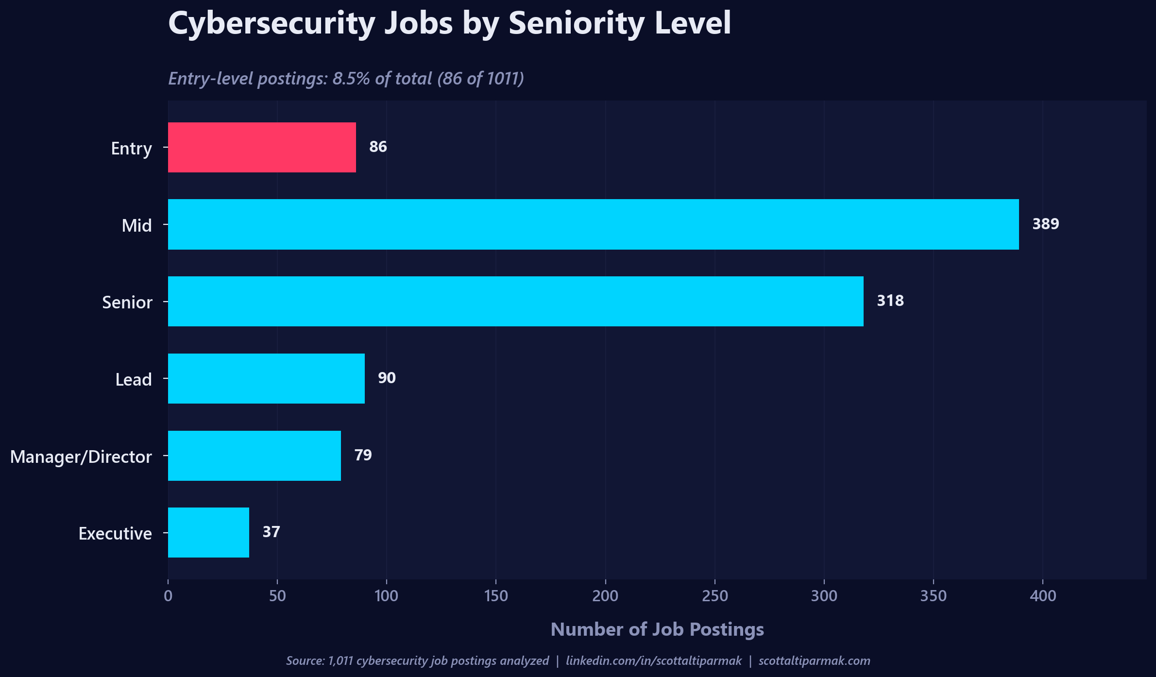 86 of 1,011 postings, or 8.5%, are entry level. That is the real shape of the "cyber talent shortage" conversation that gets recycled every year: the market wants mid and senior people, a lot of them, and it wants them now. Mid and Senior together are 70% of the dataset.